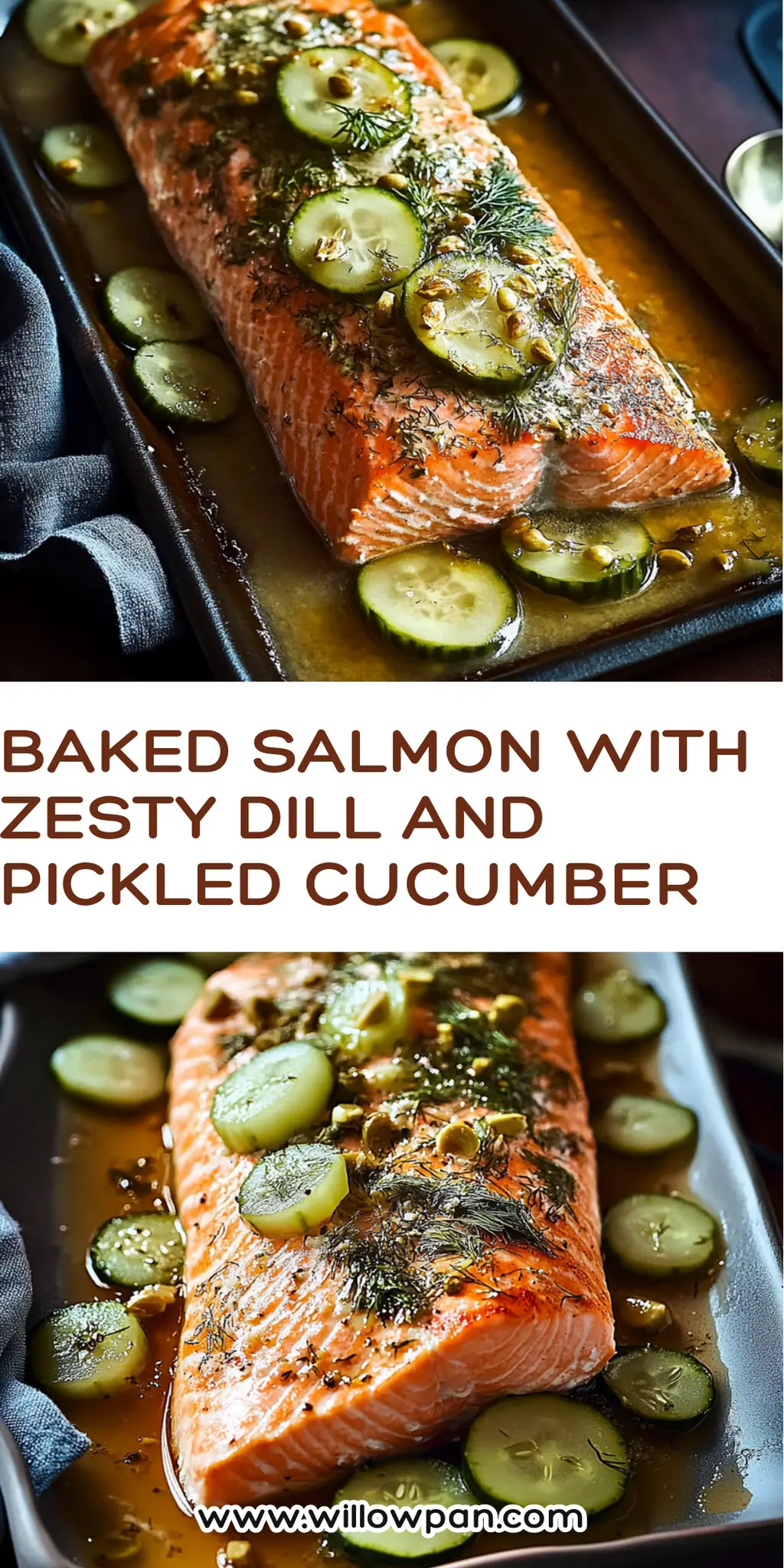- Plate the baked salmon topped with zesty dill sauce and serve alongside pickled cucumber.